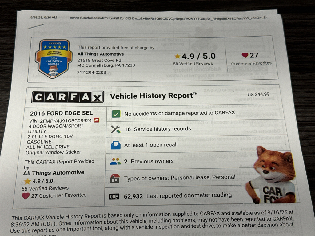 Take a trip to All Things Automotive in scenic Fulton County, Pennsylvania to see this Clean 2016 Ford Edge SEL! This pre-owned mid-size SUV has an I4, 2.0L gas engine with all wheel drive, an automatic transmission, a clean CARFAX report, ensuring both strong performance and a comfortable ride.