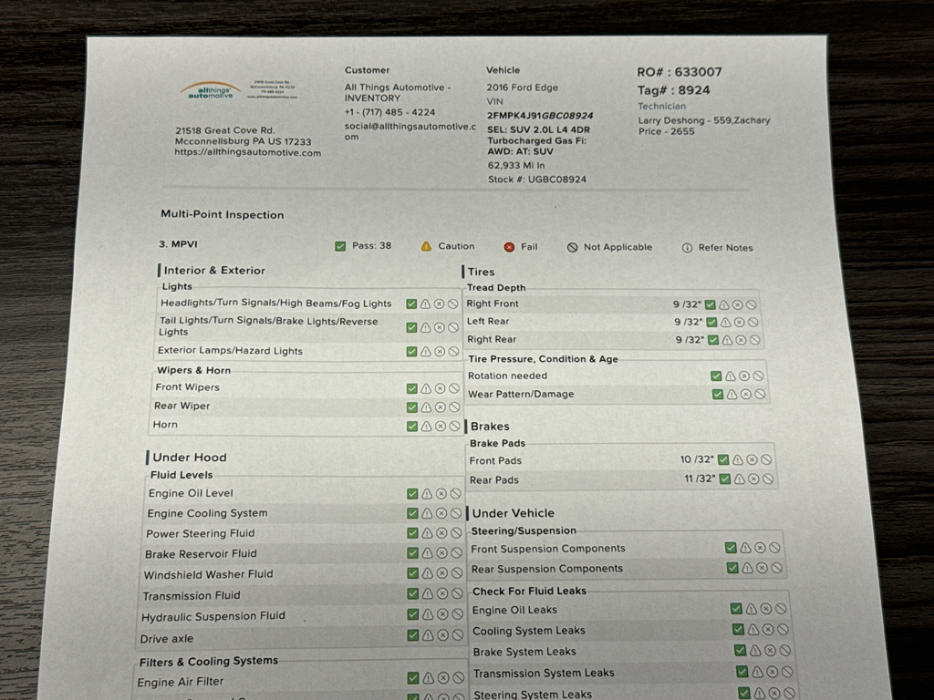 Every vehicle at All Things Automotive undergoes a full mechanical inspection and standard service including a brake caliper service, oil change, new engine and cabin air filters, and multi point inspection! All wearables are no less than double the state safety minimums.