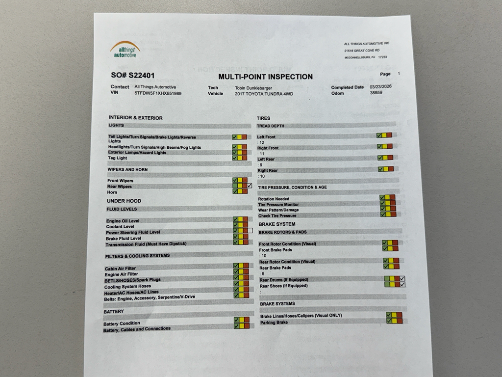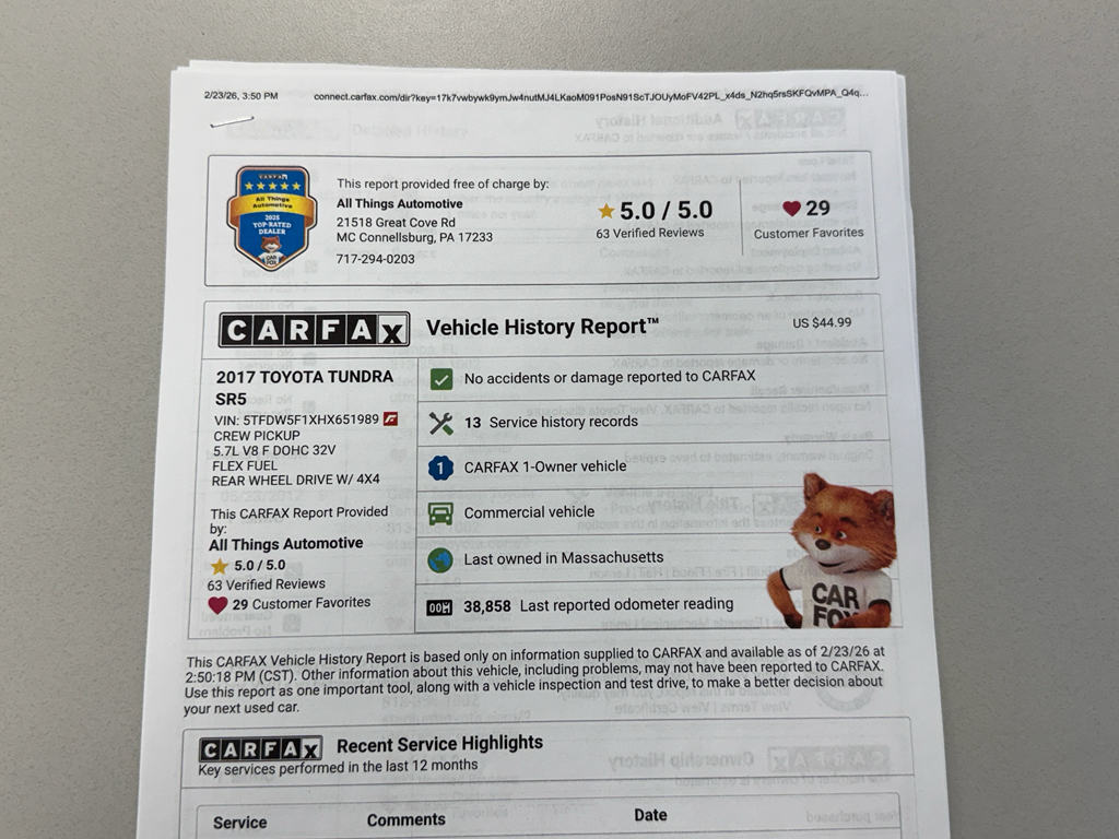 2017 Toyota Tundra SR5 — 4WD, V8 5.7L, 38,860 miles — located in McConnellsburg, PA. This rugged, dependable pickup blends brute strength with everyday comfort, delivering the power you need and the features you want. The V8 5.7L engine runs on Gasoline/E85 and pairs with a 4WD system for confident towing, hauling, and off-road capability. Meticulously maintained and backed by a CARFAX Clean Report, this Toyota Tundra is a CARFAX 1-Owner vehicle, reflecting careful ownership and low mileage for its year.