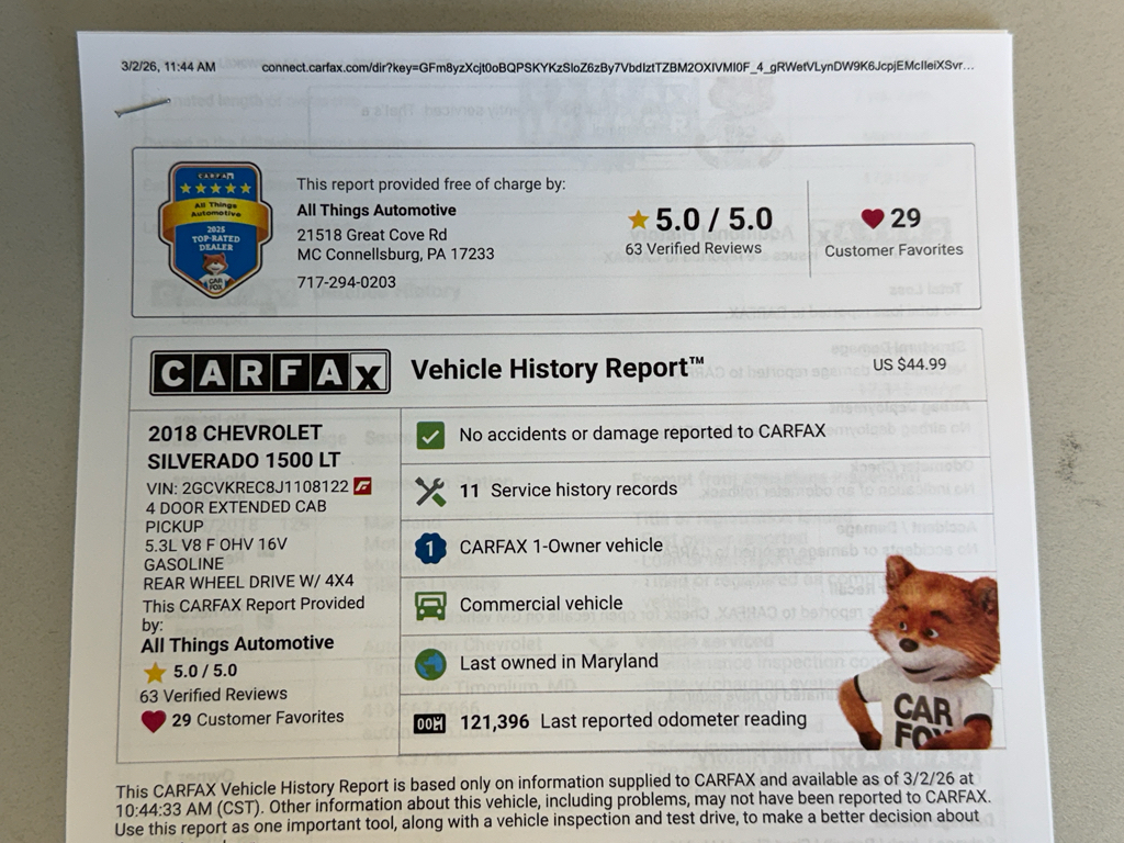 Located in McConnellsburg, PA, this 2018 Chevrolet Silverado 1500 LT 4WD with a 5.3L V8 is competitively priced to offer the best value for buyers seeking performance, reliability, and modern convenience features. Contact us to schedule a test drive and experience this capable truck yourself.
