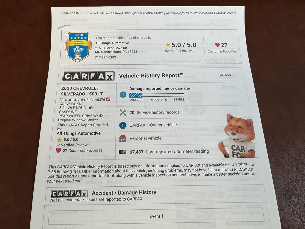 Ready to conquer worksite demands and weekend adventures, this 2020 Chevrolet Silverado 1500 LT 4WD with the powerful V8 5.3L gasoline engine is located in McConnellsburg, PA — and it's priced to move. This Chevrolet Silverado delivers rugged capability and modern convenience, making it the best price in the area for a dependable full-size pickup. The Off-Road Package adds enhanced suspension and protective features so you can tackle rough trails or seasonal drives with confidence. Apple CarPlay integration keeps navigation, music, and messaging seamless from your iPhone, while steering wheel audio controls let you stay focused on the road. The back-up camera increases safety and ease when parking or hitching trailers, and the heated steering wheel adds comfort during cold Pennsylvania winters.