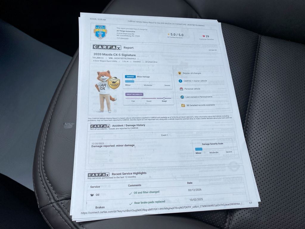 It keeps you comfortable with Auto Climate. This 2020 Mazda CX-5 offers Android Auto for seamless smartphone integration. The leather seats in this vehicle are a must for buyers looking for comfort, durability, and style. The vehicle enhances safety with a blind spot monitor, alerting drivers to potential dangers in adjacent lanes. It features a high end BOSE stereo system. This model features a hands-free Bluetooth phone system. You'll never again be lost in a crowded city or a country region with the navigation system on the Mazda CX-5. The vehicle offers Apple CarPlay for seamless connectivity. Keep your hands warm all winter with a heated steering wheel in this unit . The rear parking assist technology on it will put you at ease when reversing. The system alerts you as you get closer to an obstruction. Good News! This certified CARFAX 1-owner vehicle has only had one owner before you.