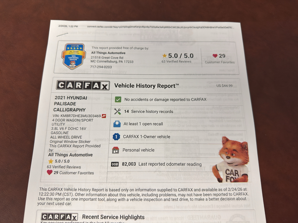 2021 Hyundai Palisade Calligraphy AWD — Premium V6 performance and luxury, now available in McConnellsburg, PA at the best price. This meticulously maintained Hyundai Palisade features a smooth and powerful 3.8L V6 gasoline engine paired with all-wheel drive for confident handling in any season. The Calligraphy trim delivers upscale appointments and advanced technology to keep passengers comfortable and connected on every journey.