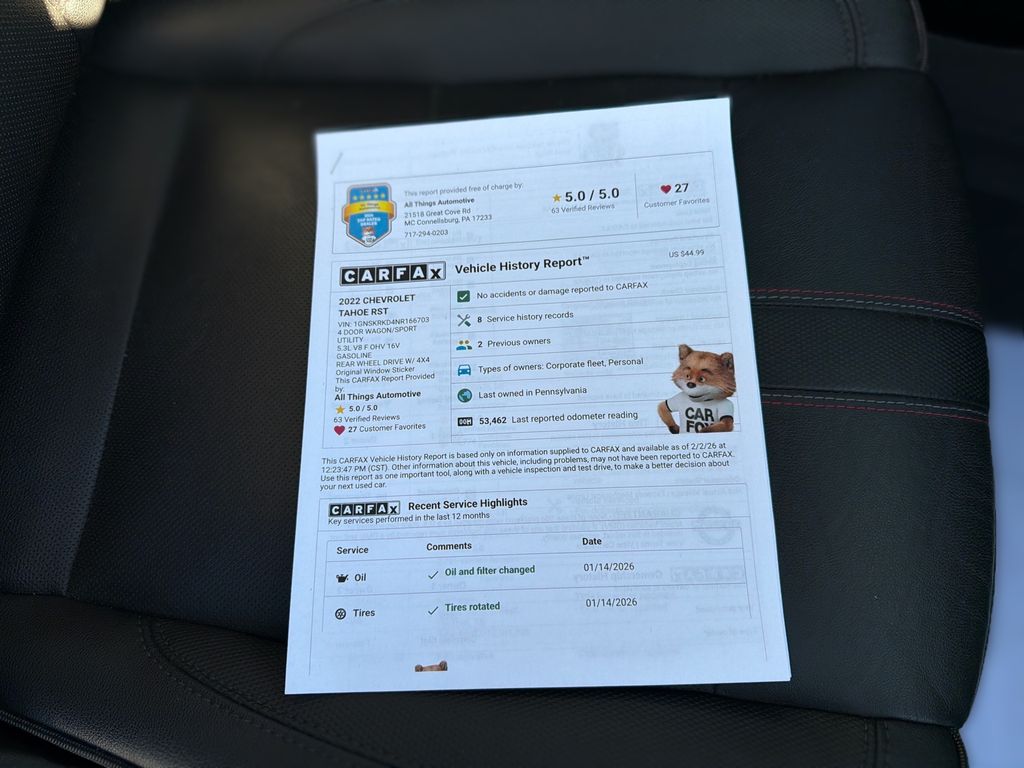 2022 Chevrolet Tahoe RST 4WD — powerful V8 performance and premium comfort at the best price in Bedford, PA. This pre-owned Chevrolet Tahoe features a robust 5.3L V8 gasoline engine paired with four-wheel drive for confident towing, highway passing and off-road capability. The RST trim adds sporty styling, leather seats and upscale touches throughout the cabin, making long trips more comfortable for driver and passengers. Stay connected and entertained with Apple CarPlay and XM Radio, while the back-up camera enhances safety and maneuverability in tight spaces. Cold-weather convenience comes from the heated steering wheel, keeping hands warm during winter drives. Spacious third-row seating and generous cargo capacity make this Chevrolet Tahoe ideal for families, weekend adventures or hauling gear. Well-maintained and ready to drive away in Bedford, PA, this Chevrolet Tahoe combines rugged capability with refined features at the best price in the area. Whether you need a reliable daily driver, a towing-capable SUV or a comfortable long-distance cruiser, this 2022 Chevrolet Tahoe RST 4WD delivers value and performance. Contact us today to schedule a test drive and see why this Chevrolet Tahoe is an exceptional find for drivers seeking power, comfort and modern tech.