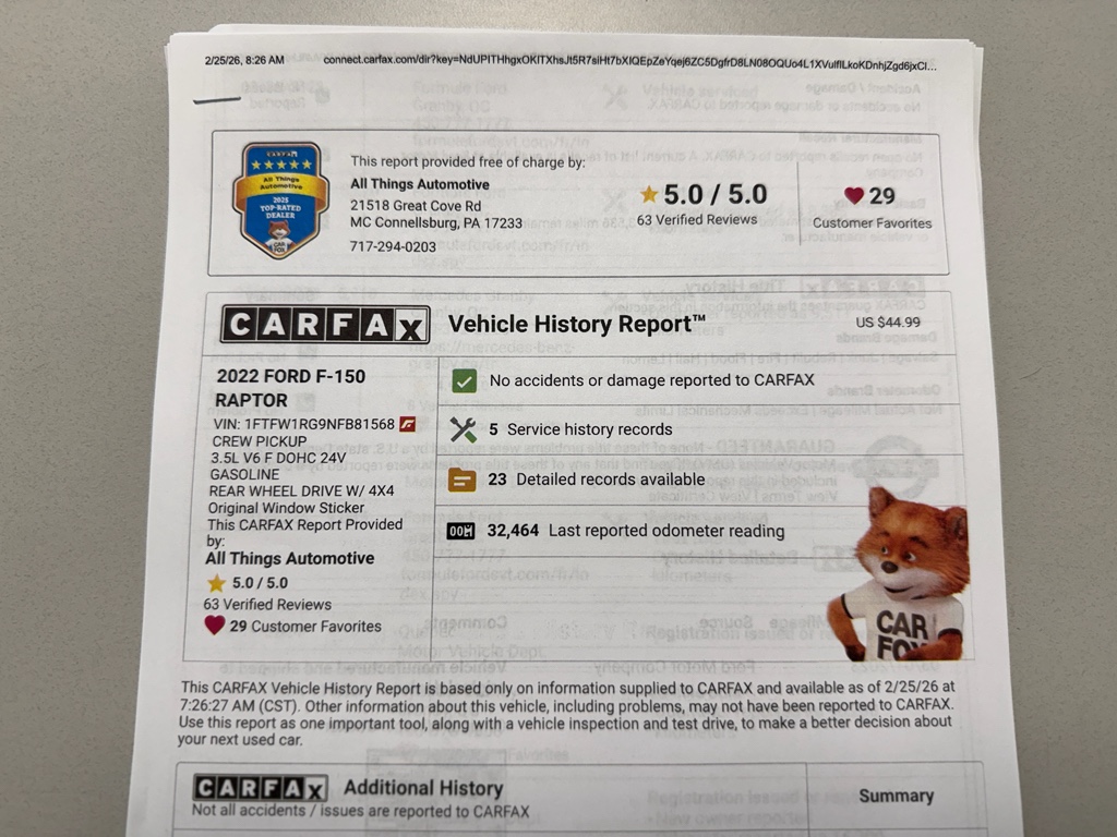 This pre-owned 2022 Raptor has been carefully maintained and inspected, offering a like-new driving experience without the new-vehicle price tag. Whether you need a truck for trail work, weekend recreation, or a reliable ride around McConnellsburg and beyond, this Ford F-150 Raptor checks every box.