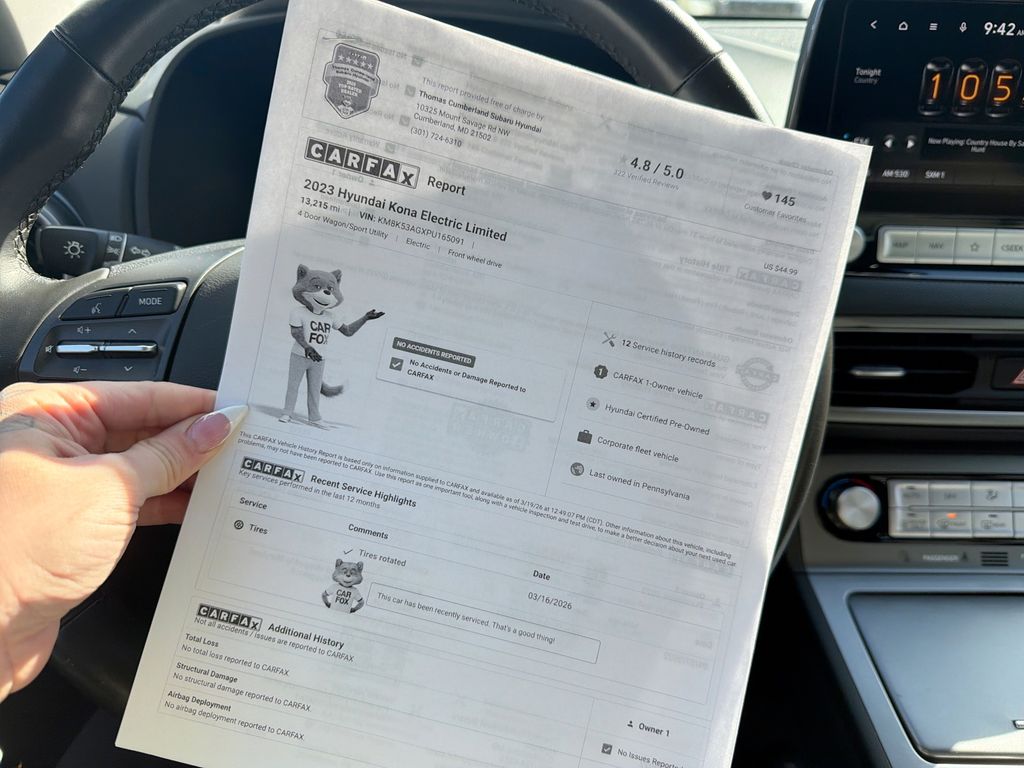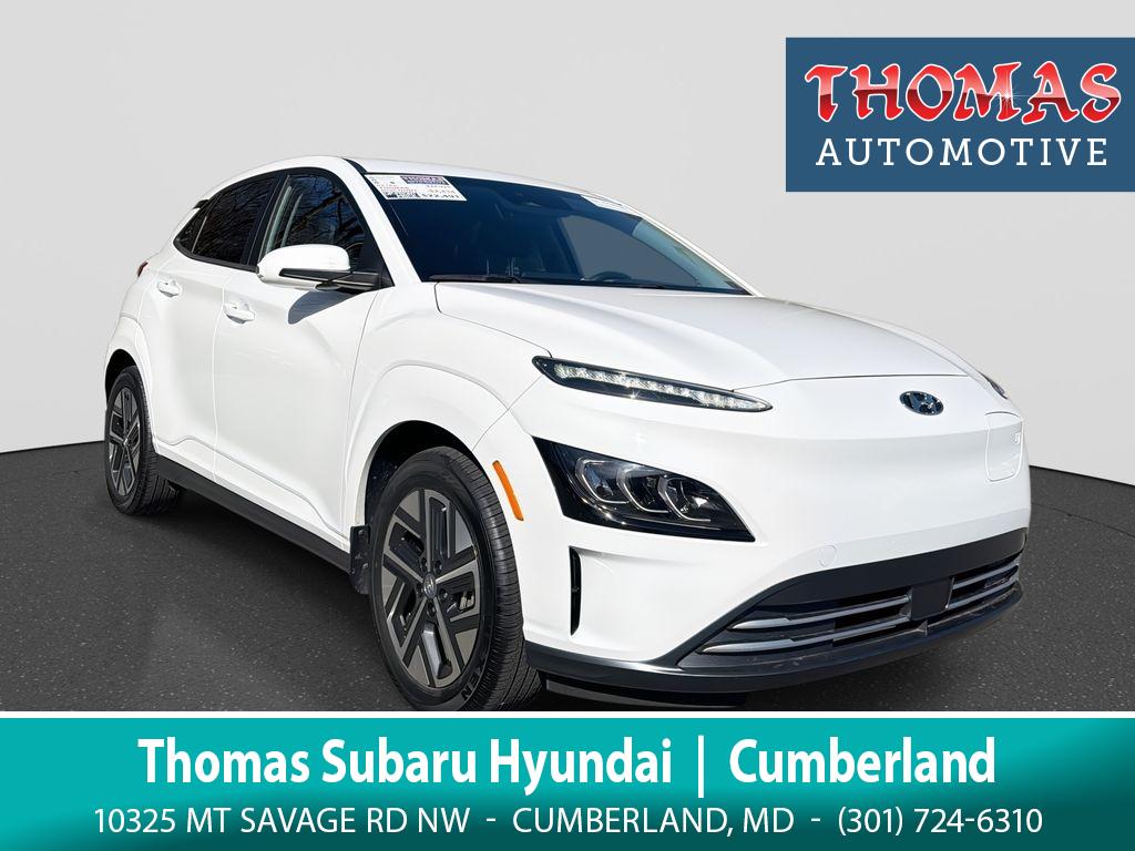 2023 Hyundai Kona EV Limited — Low-mileage electric crossover located in Cumberland, MD. This Hyundai Kona EV Limited has only 11,807 miles, a front-wheel-drive layout, and an efficient electric motor that delivers instant torque and quiet, emissions-free driving. Priced to move, it offers the best price for a like-new Hyundai Kona EV in the region. Premium features include a heated steering wheel, Apple CarPlay for seamless smartphone integration, back-up camera for confident parking, and remote start for comfort before you step inside. The CARFAX Clean Report confirms a well-maintained history, giving you extra peace of mind when buying a pre-owned vehicle. Comfortable seating, advanced safety technologies, and the Limited trim's upscale interior make this Hyundai Kona EV ideal for daily commuting or weekend escapes. Quick charging compatibility and an efficient electric drivetrain mean fewer stops and lower operating costs compared with gas-powered rivals. Located in Cumberland, MD, this 2023 Hyundai Kona EV Limited is a standout choice for drivers seeking a reliable, low-mileage electric vehicle at the best price available locally. Contact us to schedule a test drive or request the CARFAX report and learn about available financing and incentives. Drive electric with confidence in this feature-packed Hyundai Kona EV.