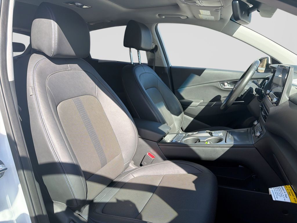 This vehicle offers Automatic Climate Control for personalized comfort. See what's behind you with the back up camera on this model. The installed navigation system will keep you on the right path. This small suv comes equipped with Android Auto for seamless smartphone integration on the road. This unit features a hands-free Bluetooth phone system. Never get into a cold vehicle again with the remote start feature on this unit. Apple CarPlay: Seamless smartphone integration for this vehicle - stay connected and entertained on the go! The leather seats in this Hyundai Kona EV are a must for buyers looking for comfort, durability, and style. Our dealership has already run the CARFAX report and it is clean. A clean CARFAX is a great asset for resale value in the future. This vehicle is a certified CARFAX 1-owner. Keep your hands warm all winter with a heated steering wheel in this model .