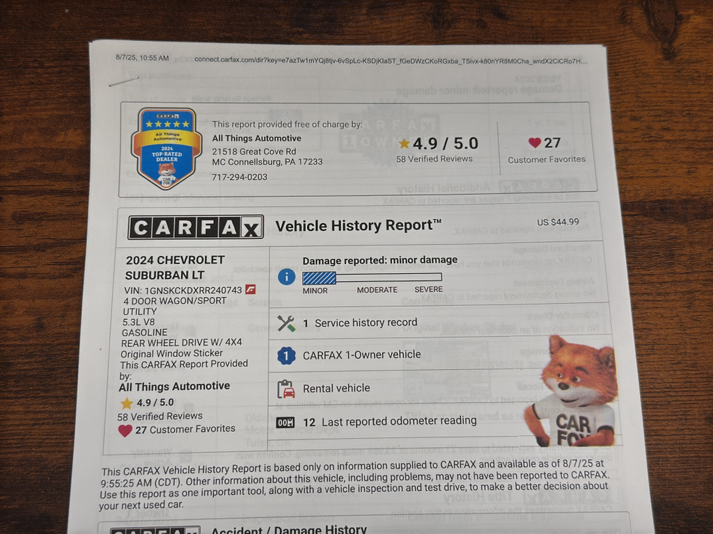Take a trip to All Things Automotive in scenic Fulton County, Pennsylvania to see this Midnight Blue Metallic Chevrolet Suburban! This pre-owned 1/2 ton SUV has a V8, 5.3L gas engine with 4 wheel drive, an automatic transmission, and is a CARFAX certified 1-Owner vehicle, ensuring both strong performance and a comfortable ride.