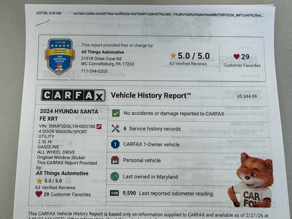 Priced to sell, this Hyundai Santa Fe XRT offers the best price in the area—an outstanding opportunity for buyers seeking a lightly pre-owned, well-equipped AWD SUV. Visit our McConnellsburg, PA location to inspect this low-mileage 2024 Hyundai Santa Fe XRT and take advantage of an exceptional combination of performance, technology, and value. Schedule a test drive today.