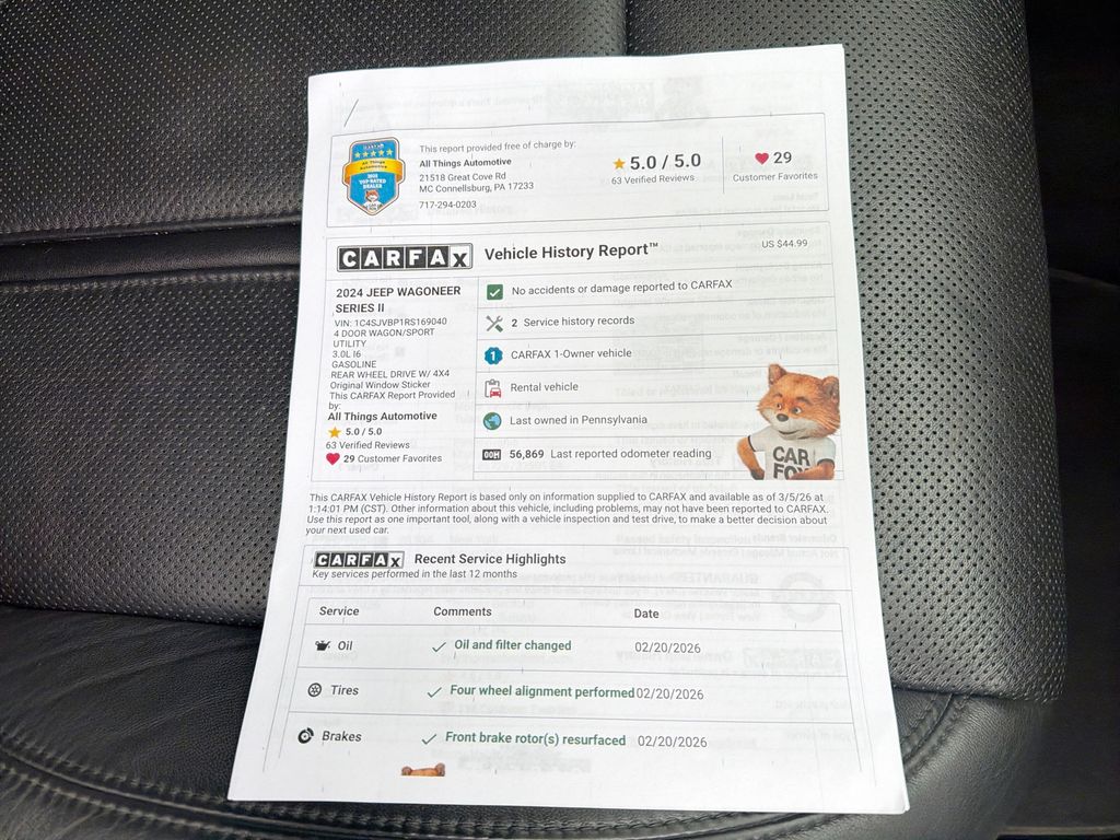 Experience premium capability and comfort with this 2024 Jeep Wagoneer Series II, now available in Bedford, PA. Built with a robust 3.0L V6 gasoline engine and full-time 4WD, this Jeep Wagoneer delivers confident towing, composed highway manners, and the off-road readiness Jeep is known for. The Series II trim adds refined luxury with genuine leather seats and a heated steering wheel for chilly Pennsylvania mornings. Stay connected and entertained via Android Auto integration, while advanced safety features such as Forward Collision Warning and a Back-Up Camera help protect you and your passengers on every drive. The spacious cabin provides versatile seating and cargo options, making this Jeep Wagoneer ideal for family trips, commuting, or weekend adventures. This vehicle has been carefully inspected and maintained to ensure reliable performance and long-term value. With its combination of premium comfort, modern technology, and proven capability, this 2024 Jeep Wagoneer Series II stands out in its class. Located in Bedford, PA, this vehicle is competitively priced and currently offered at the best price in the area — exceptional value for buyers seeking a luxury-capable SUV without compromise. Contact us to schedule a test drive or to get more information about financing and vehicle history. Explore this Jeep Wagoneer in person and experience why it's an outstanding choice for drivers who demand comfort, capability, and safety.