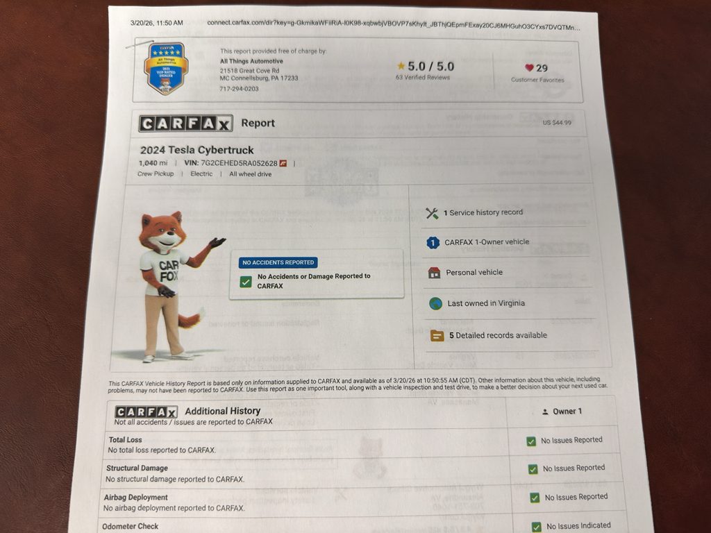 Priced to sell — we're offering the best price on this Tesla Cybertruck in the region. Financing options are available, and our team can arrange test drives in McConnellsburg, PA. A CARFAX 1-Owner report is available upon request to confirm history and provide added peace of mind.