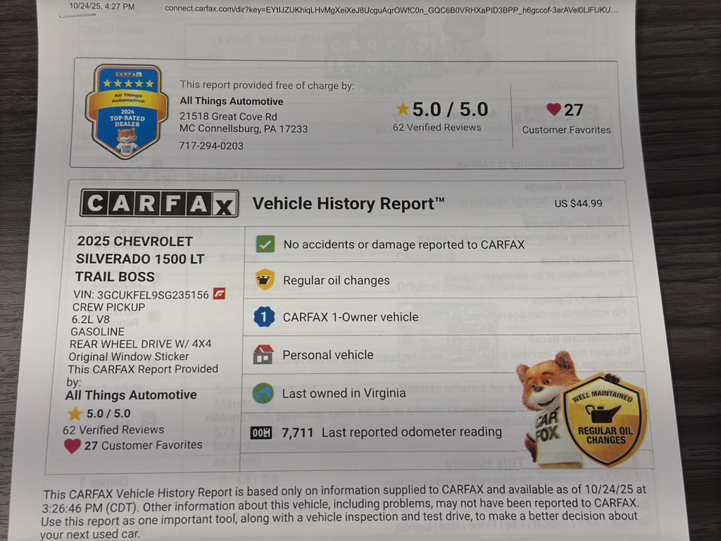 Visit us in McConnellsburg, PA to see this low-mileage 2025 Chevrolet Silverado 1500 LT Trail Boss in person and take advantage of the best price available. Contact us today to schedule a test drive or request the CARFAX report and start your next journey with Chevrolet confidence.