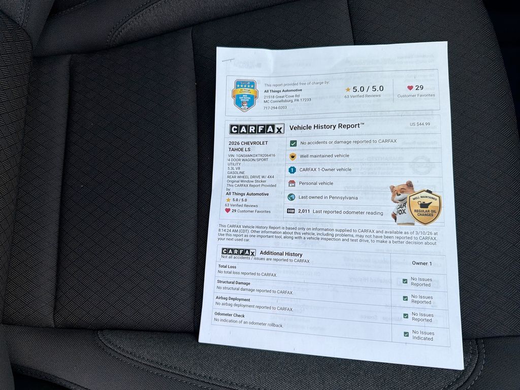 2026 Chevrolet Tahoe LS — 4WD, V8 5.3L, 1,011 miles — Bedford, PA Drive home in a powerful, low-mileage 2026 Chevrolet Tahoe LS with a robust 5.3L V8 and dependable four-wheel drive. This Chevrolet Tahoe blends rugged capability with modern convenience, featuring XM Radio, Apple CarPlay, Remote Start, and built-in Navigation for seamless connectivity and comfort on every trip. With CARFAX 1-Owner history and only 1,011 miles, this SUV delivers like-new condition while offering the best price you'll find in Bedford, PA. Engineered for family travel and weekend adventures, the Chevrolet Tahoe LS provides spacious seating, generous cargo capacity, and confident towing capability thanks to its V8 power. Remote Start ensures easy cold-weather starts, and Apple CarPlay keeps your favorite apps and directions at your fingertips. The navigation system guides you on long journeys, while XM Radio adds entertainment options for every drive. This Chevrolet Tahoe is priced to move — exceptional value for its condition and features. Low mileage, single-owner history, and a comprehensive feature set make it an outstanding choice for buyers seeking reliability and performance without the new-vehicle premium. Contact us in Bedford, PA to schedule a test drive and secure the best price on this well-equipped 2026 Chevrolet Tahoe LS.